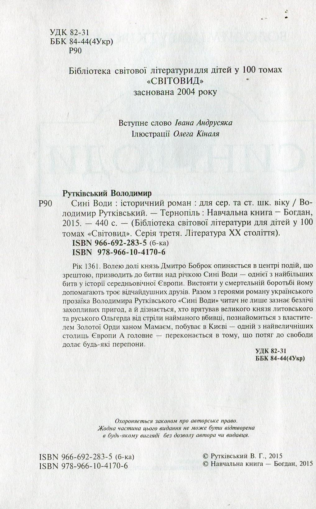 Рік 1361. Волею долі князь Дмитро Боброк опиняється в центрі подій, що зрештою, призводить до битви над річкою Сині Води — однієї з найбільших битв у історії середньовічної Європи. Вистояти у смертельній боротьбі йому допомагають троє відчайдушних друзів. Разом з героями роману українського прозаїка Володимира Рутківського «Сині Води» читач не лише зазнає безлічі захопливих пригод, а й дізнається, хто врятував великого князя литовського та руського Ольгерда від стріли найманого вбивці, познайомиться з властителем Золотої Орди ханом Мамаєм, побуває в Києві — одній з найвеличніших столиць Європи А головне — переконається в тому, що потяг до свободи долає будь-які перепони.