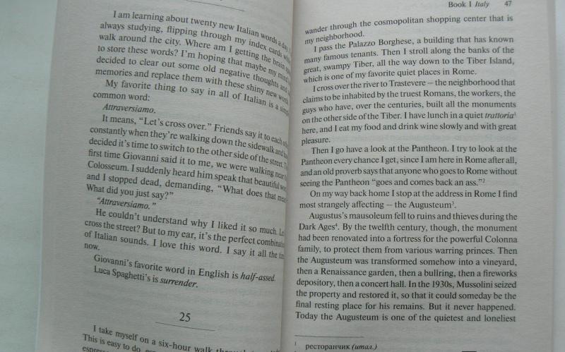 Несмотря на все современные атрибуты женского счастья: удачное замужество, роскошный загородный дом, многообещающую карьеру, Элизабет не чувствует себя счастливой. В страстном стремлении обрести радость жизни и внутренний покой она отправляется в Италию, затем в Индию и, наконец, в Индонезию, где ей удаётся понять себя и найти гармонию с миром. В книге представлен сокращённый и адаптированный текст уровня Intermediate.