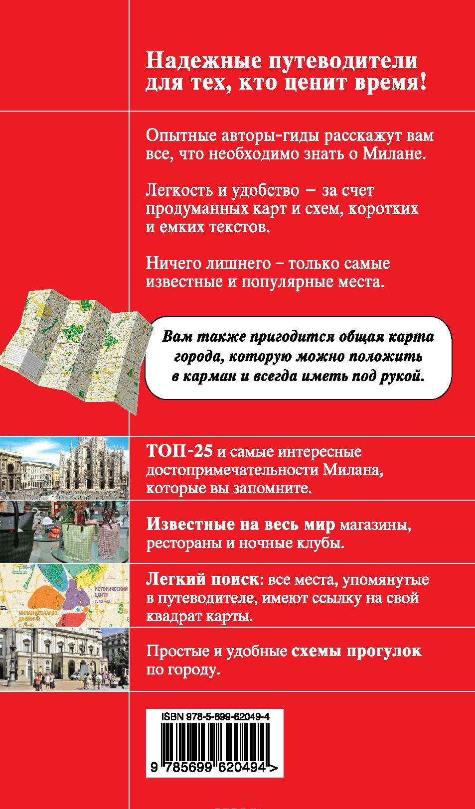 Перед вами экспресс-гид по Милану. В нем содержится краткая информация о столице, советы, как лучше провести первый и второй дни, и 25 главных достопримечательностей. Также в книге вы найдете описания самых интересных мест каждого района города. Гуляйте, знакомьтесь, восхищайтесь роскошным Миланом и получайте нужную информацию в режиме нон-стоп! К изданию прилагается подробная карта города.