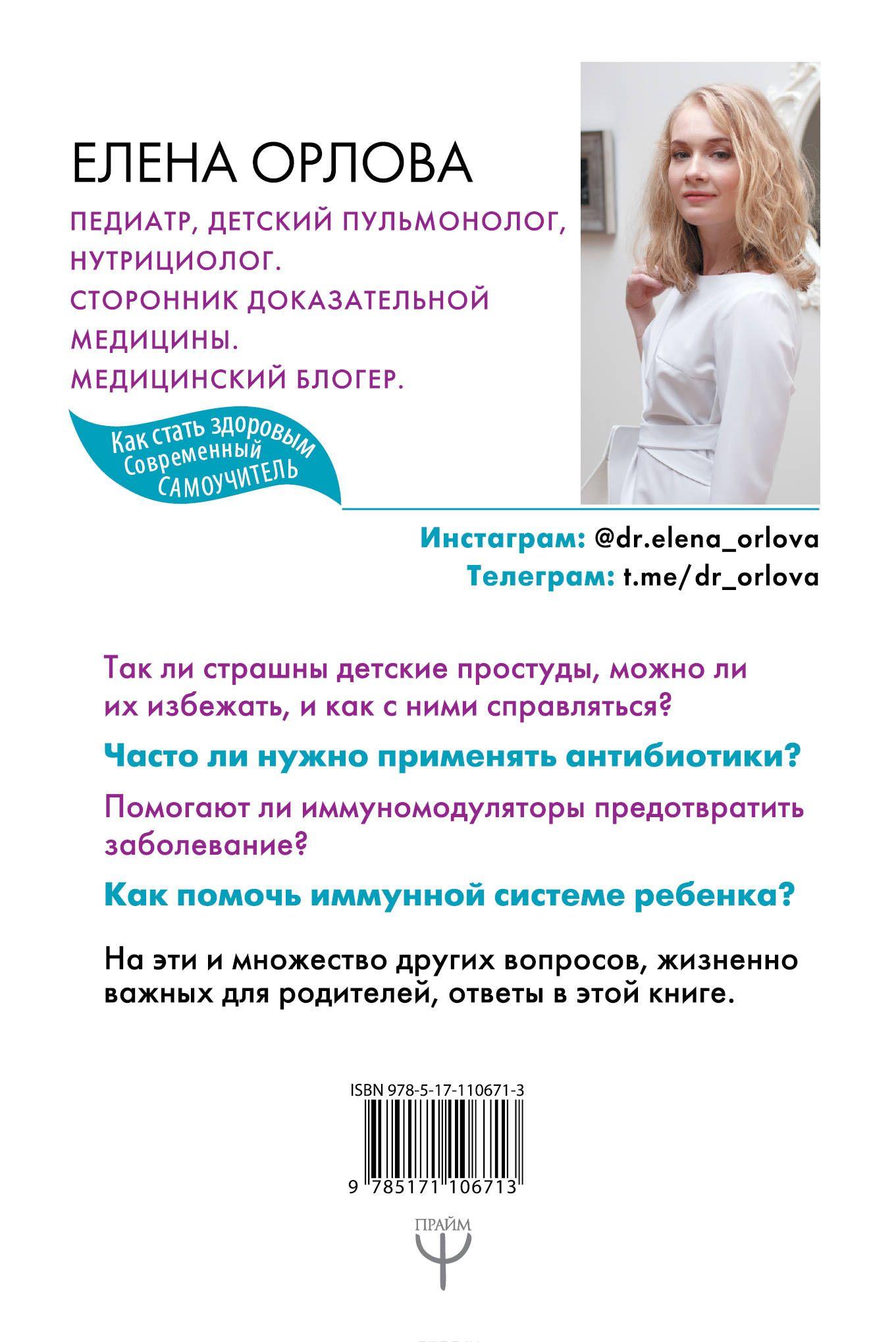 Что чаще всего обсуждают родители малышей, дошкольников и младших школьников? Детские болезни! Кашель, насморк, температура — вот предметы беспокойства большинства мам и пап. Всех пугают эти грозные аббревиатуры — ОРЗ и ОРВИ, но еще больше пугают маячащие за ними еще более грозные перспективы: отит, бронхит, ангина, пневмония, антибиотики, больница… Так ли страшны детские простуды, можно ли их избежать, и как с ними справляться? Часто ли нужно применять антибиотики? Помогают ли иммуномодуляторы предотвратить заболевание? Как помочь иммунной системе ребенка? На все эти вопросы отвечает Елена Орлова — детский врач-пульмонолог и популярный блогер.
