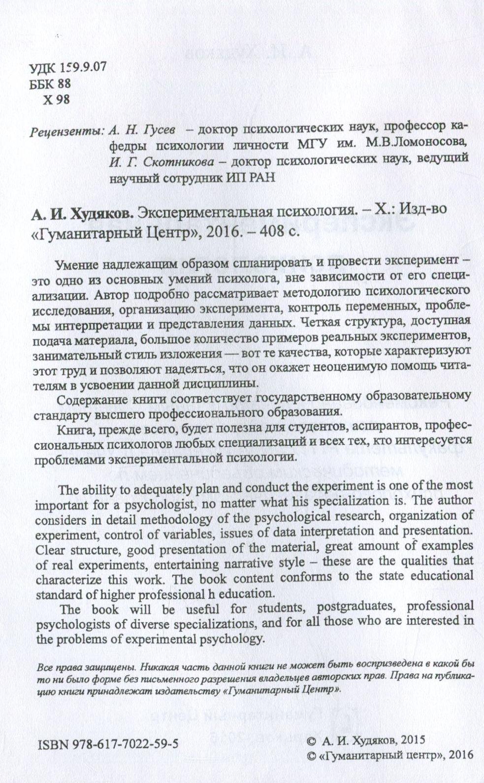 Умение надлежащим образом спланировать и провести эксперимент - это одно из основных умений психолога, вне зависимости от его специализации. Автор подробно рассматривает методологию психологического исследования, организацию эксперимента, контроль переменных, проблемы интерпретации и представления данных. Четкая структура, доступная подача материала, большое количество примеров реальных экспериментов, занимательный стиль изложения - вот те качества, которые характеризуют этот труд и позволяют надеяться, что он окажет неоценимую помощь читателям в усвоении данной дисциплины.