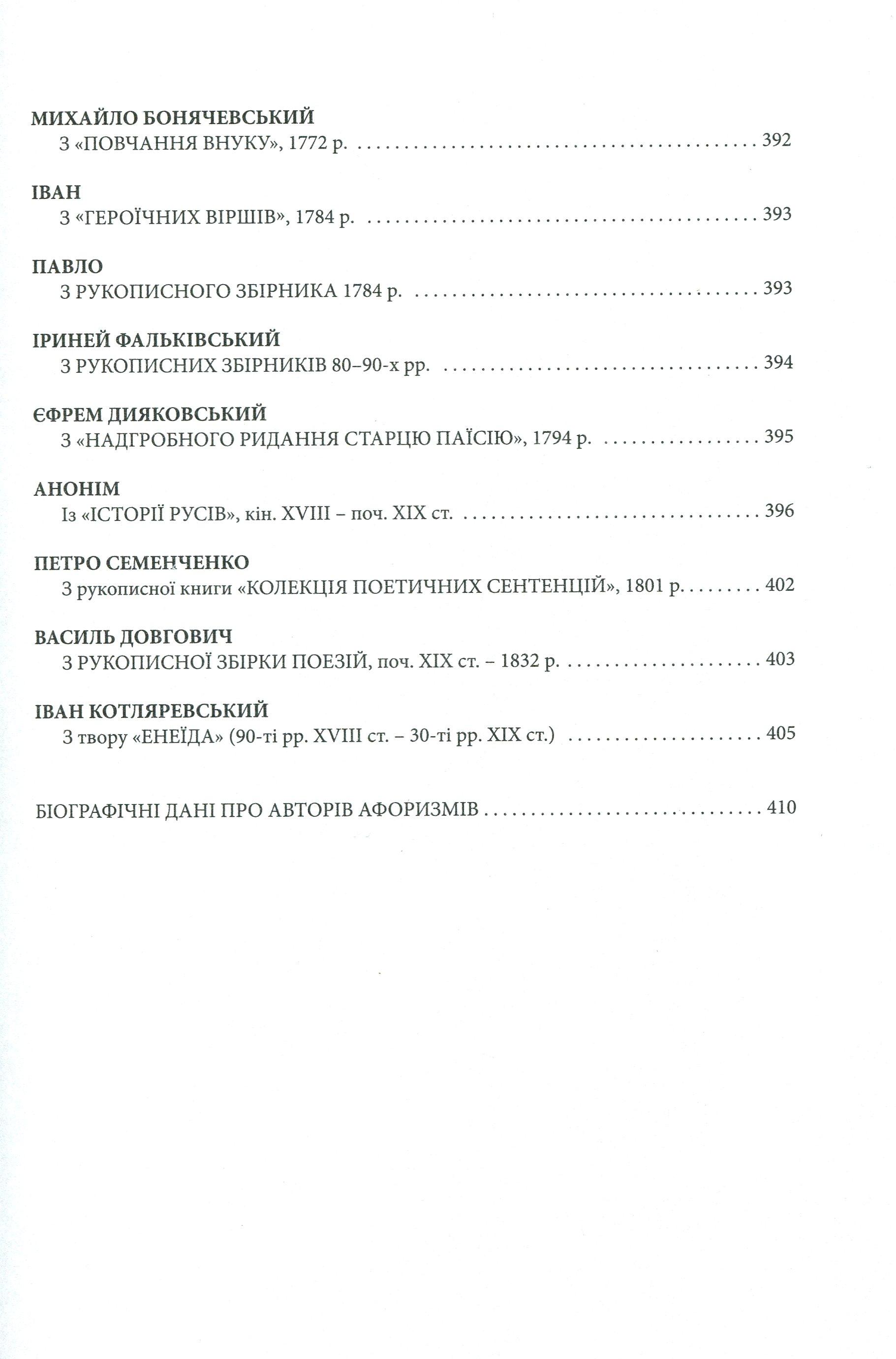 Пропонована книжка — це унікальне, найповніше зібрання авторських афоризмів, що творились українськими мислителями упродовж XІ – поч. XIX століть. Це видання, по суті, є книгою духовно-інтелектуального буття українського народу за вісім століть.