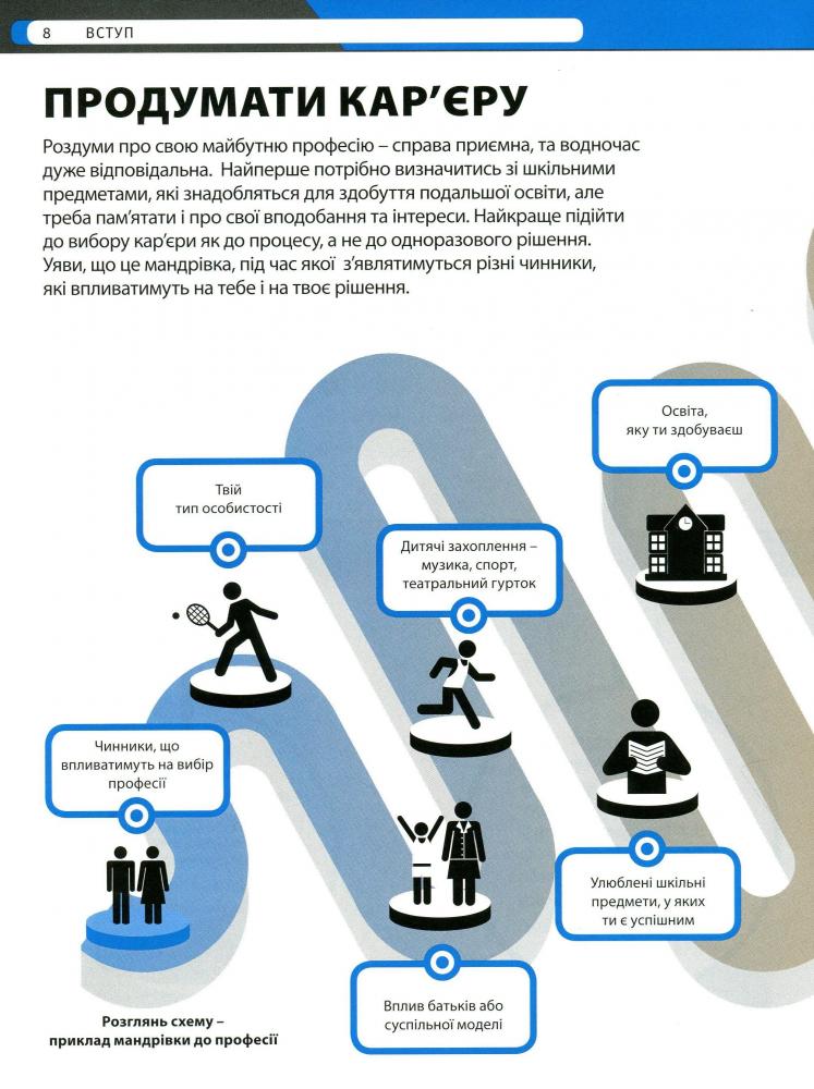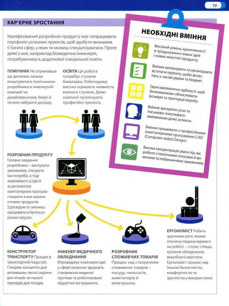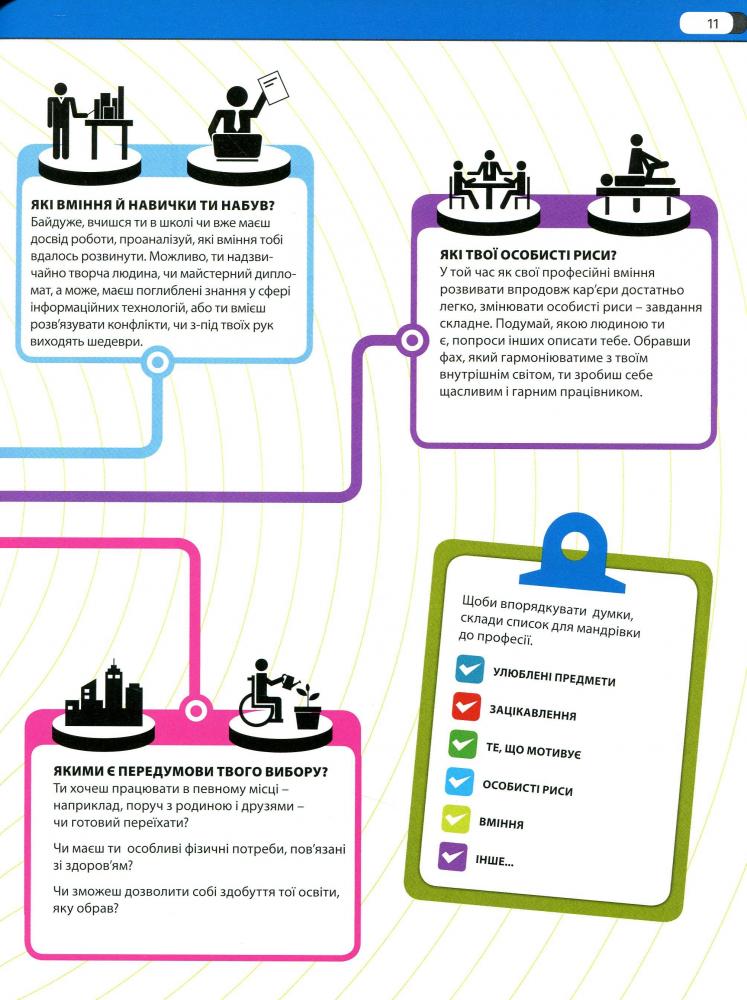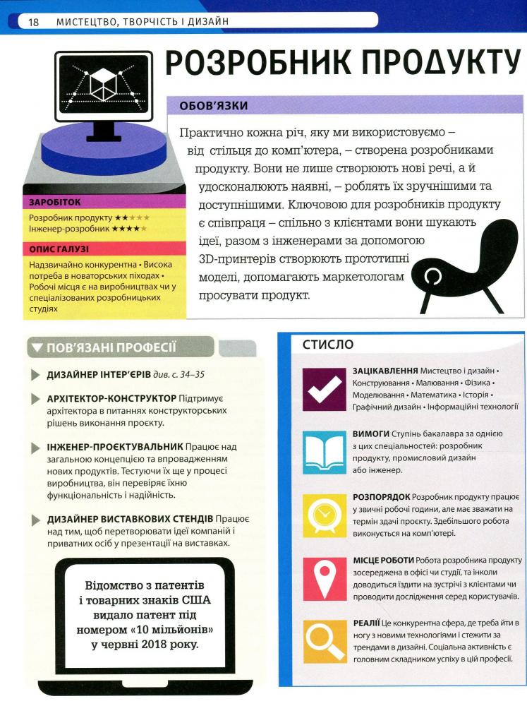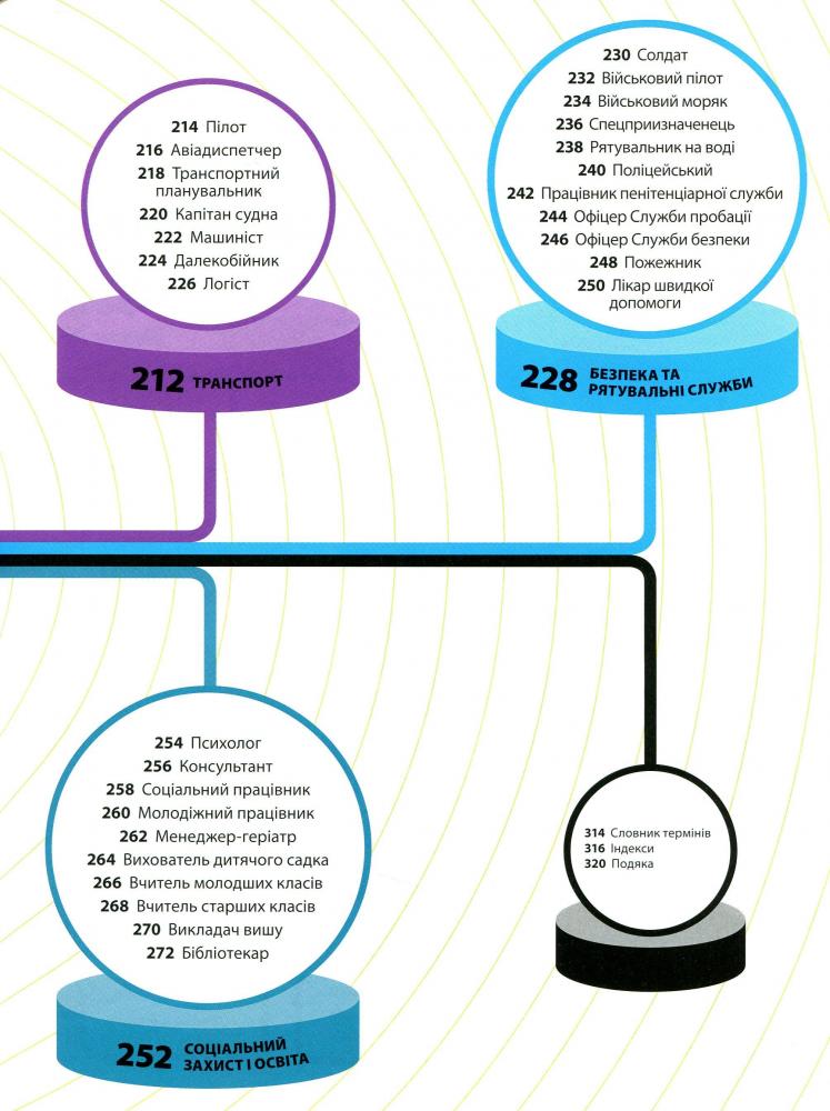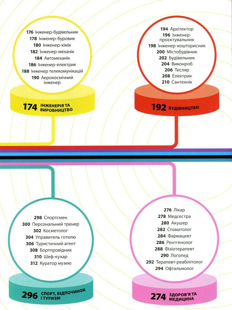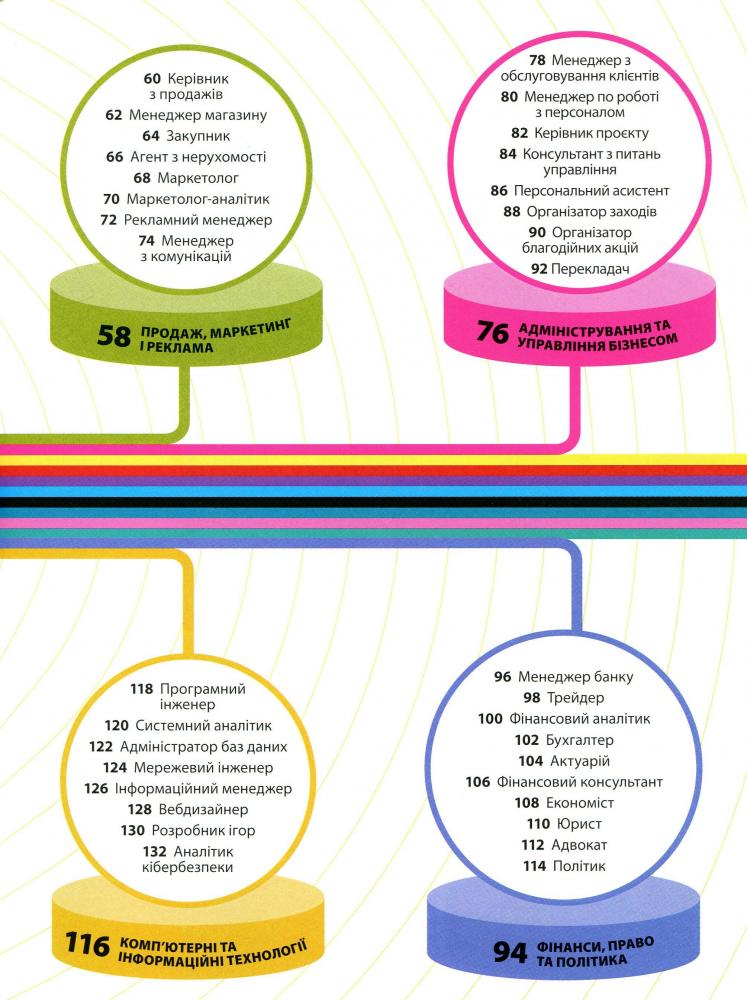 Книжка точно допоможе тобі обрати саме твою професію, бо містить яскраву інфографіку й детальні описи кожної — кар’єрне зростання, перелік необхідних знань і вмінь, загальний аналіз галузі, рівень заробітку та ще багато всього.