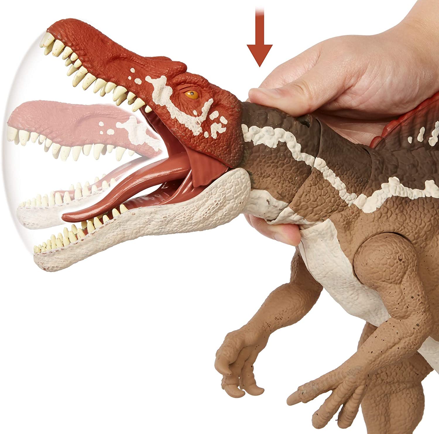 Jurassic World Extreme Chompin' Spinosaurus - это игрушка динозавра Спинозавра, выпущенная по мультсериалу от NETFLIX Мир юрского периода: Меловой лагерь. Данная версия динозавра является перекрашеной версией ранее выпускавшегося Спинозавра темно-серого цвета.