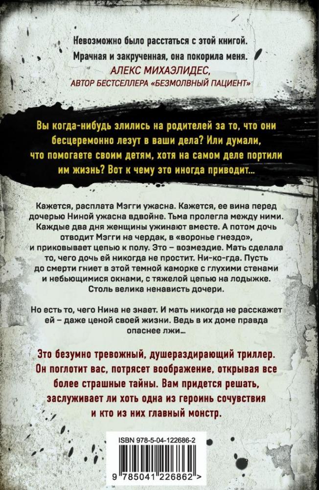 Кажется, расплата Мэгги - ужасна. Кажется, ее вина перед дочерью Ниной - ужасна вдвойне. Тьма пролегла между ними. Каждые два дня женщины ужинают вместе. А потом дочь отводит Мэгги на чердак, в "воронье гнездо", и приковывает цепью к полу. Это - возмездие. Мать сделала то, чего дочь ей никогда не простит. Ни-ко-гда. Пусть до смерти гниет в этой темной каморке с глухими стенами и небьющимися окнами, с тяжелой цепью на лодыжке. Столь велика ненависть дочери.