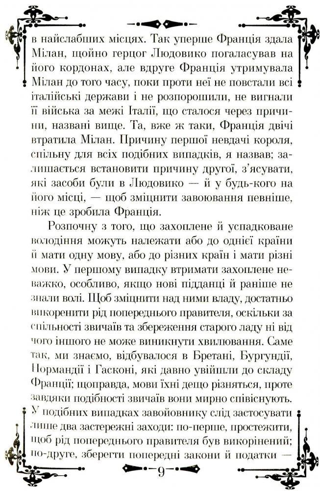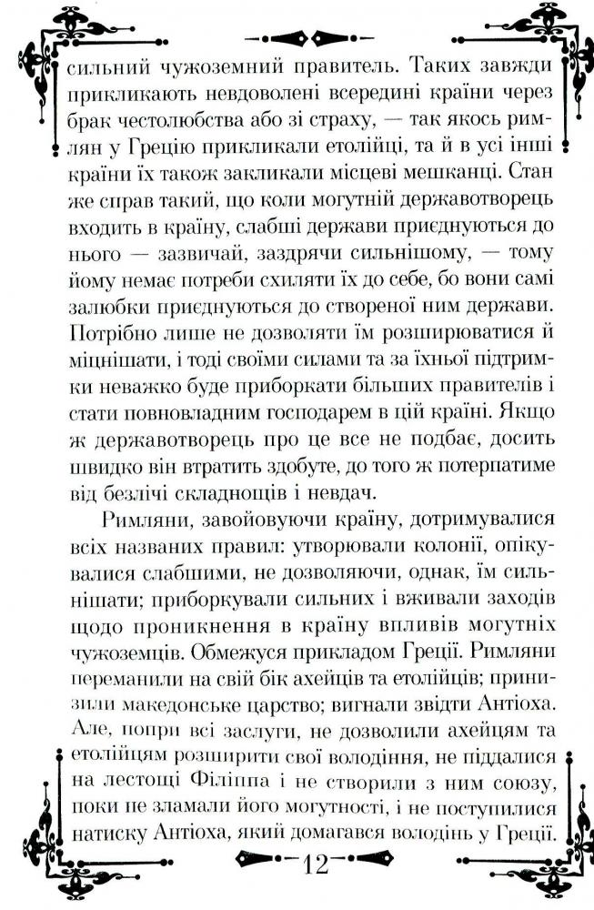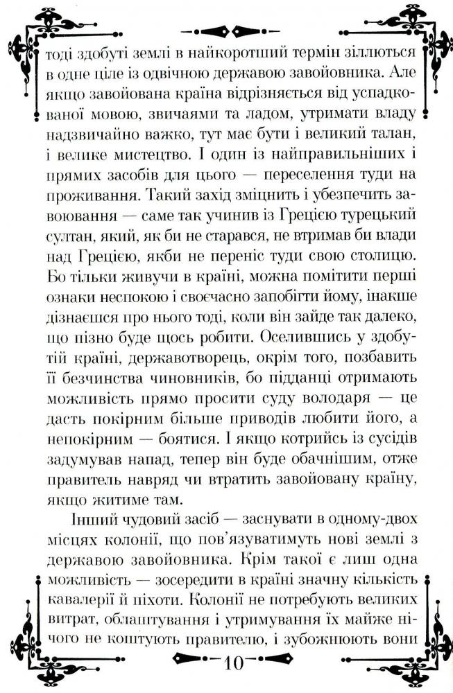 Італійський мислитель і політик Нікколо Макіавеллі (1469–1527) прославився серед сучасників передусім як автор літературних та історичних творів, а також політичних трактатів. Серед них найвідомішими стали трактати «Державотворець» та «Про військове мистецтво». Перший із них є збірником правил успішної політичної діяльності, створеним з історичного та практичного досвіду існування людської природи, що залишається незмінною за всіх політичних устроїв, які проходять природний цикл розквіту та занепаду. А другий – один із найкращих навчальних посібників із воєнних справ. До книги також увійшли «Десять листів» великого філософа, у яких мудрість межує з цинізмом.