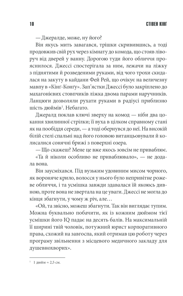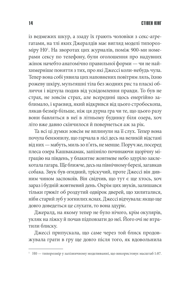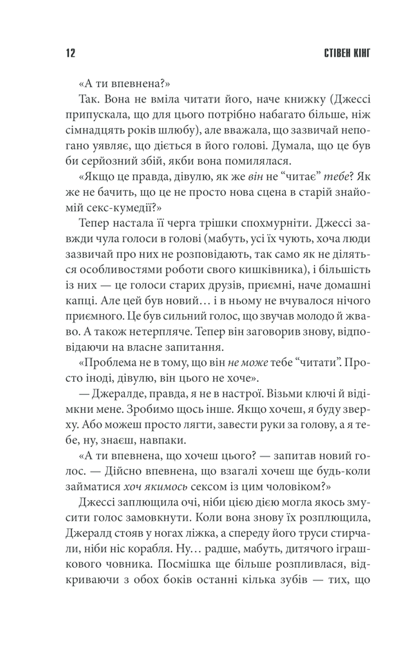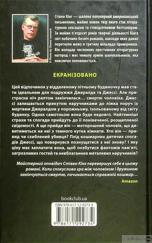 Цей відпочинок у віддаленому літньому будиночку мав стати ідеальним для подружжя Джералда та Джессі. Але пристрасна ніч раптом закінчилася... смертю чоловіка. Джессі залишається прикутою наручниками до ліжка в порожньому, ізольованому від світу будинку, поруч із мертвим Джералдом. Однак самотньою вона буде недовго. Найтемніші страхи та спогади прийдуть до її понівеченої, розщепленої свідомості. А ще прийде він — моторошний чоловік, що дивитиметься на неї з темного кутка кімнати. Хто він — привид чи схиблений убивця? Плід кошмарних дитячих спогадів Джессі, що повернувся познущатися з неї знову? І яку ціну має заплатити вона, щоб позбутися фантомів пам’яті, загрозливих гостей та невблаганних металевих наручників?