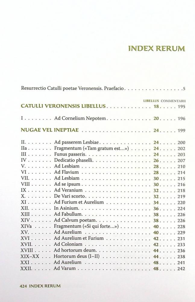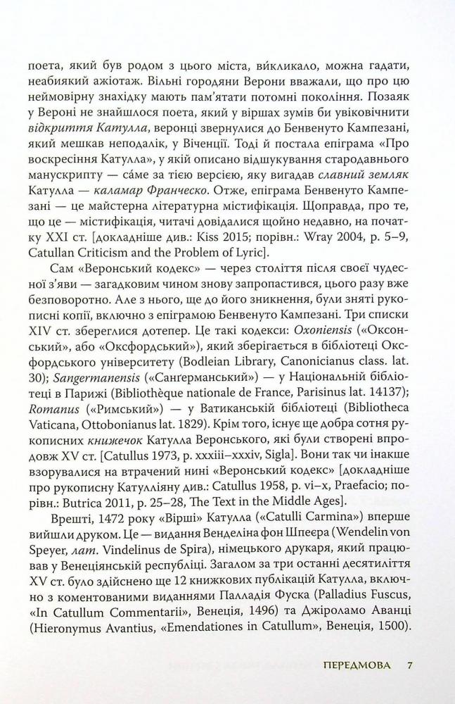 Ґай Валерій Катулл (84–54 рр. до Хр.) — найбільший лірик Давнього Риму, молодший сучасник Ціцерона і Цезаря, попередник Верґілія та інших поетів «золотої доби» римської літератури. Творець суб’єктивної лірики, лідер неотериків («нових поетів»), родом з Верони, загинув за нез’ясованих обставин у Римі. Писав «штучки поетичні», поеми на мітологічні теми, а також елегії та епіграми. Вони були об’єднані в одну «Книгу Катулла Веронського», що нараховує понад 120 поетичних творів. Як поет Катулл був наново відкритий на початку XIV ст., а відтак його поезія мала значний вплив на ренесансних поетів. До шкільних авторів не належав, але його цитували в курсах теорії поезії, зокрема в Києво-Могилянській академії. Хоча вірші Катулла почали перекладати по-українському понад сто років тому (серед перекладачів були Тарас Франко і Микола Зеров), але повне зібрання творів поета в українських перекладах виходить уперше. Видання двомовне. Латинський ориґінал опрацьовано за ренесансними рукописами та виданнями. У коментарях враховано текстологічні студії над Катуллом — від часів Ренесансу й дотепер.