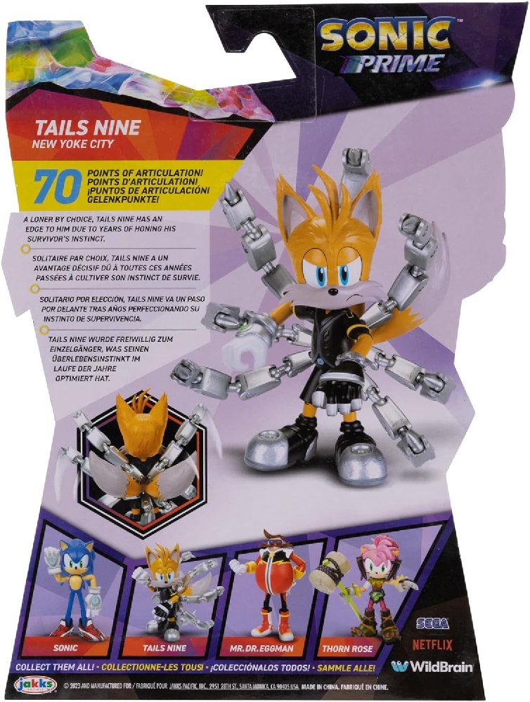 Sonic Prime Nine Tails New Yoke City Action Figure - это экшен-фигурка Тейлза по мультсериалу "Соник Прайм" (2022 года). У фигурки 12 точек артикуляции.