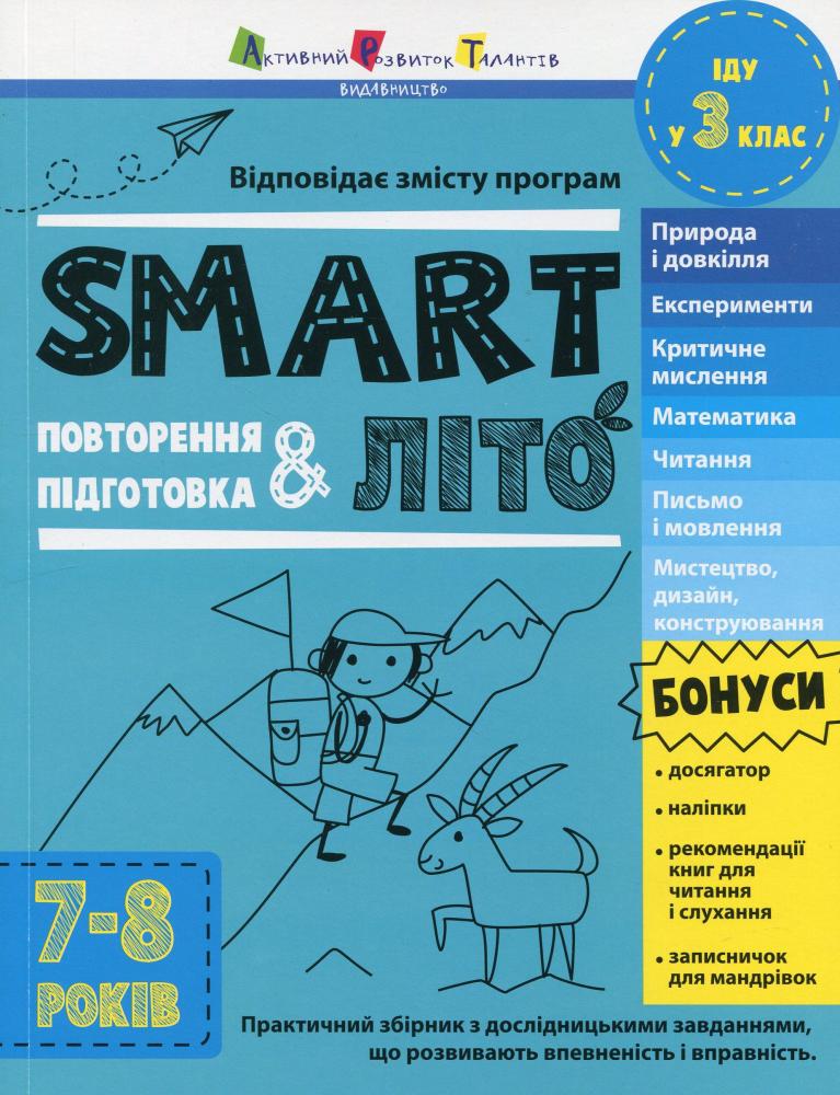 SMARTліто - практичний збірник з дослідницькими завданнями, що розвивають впевненість і вправність. Природа і довкілля, експерименти і математика, критичне мислення і читання, письмо і мовлення, мистецтво, дизайн і конструювання - креативні завдання на повторення та підготовку до наступного класу.