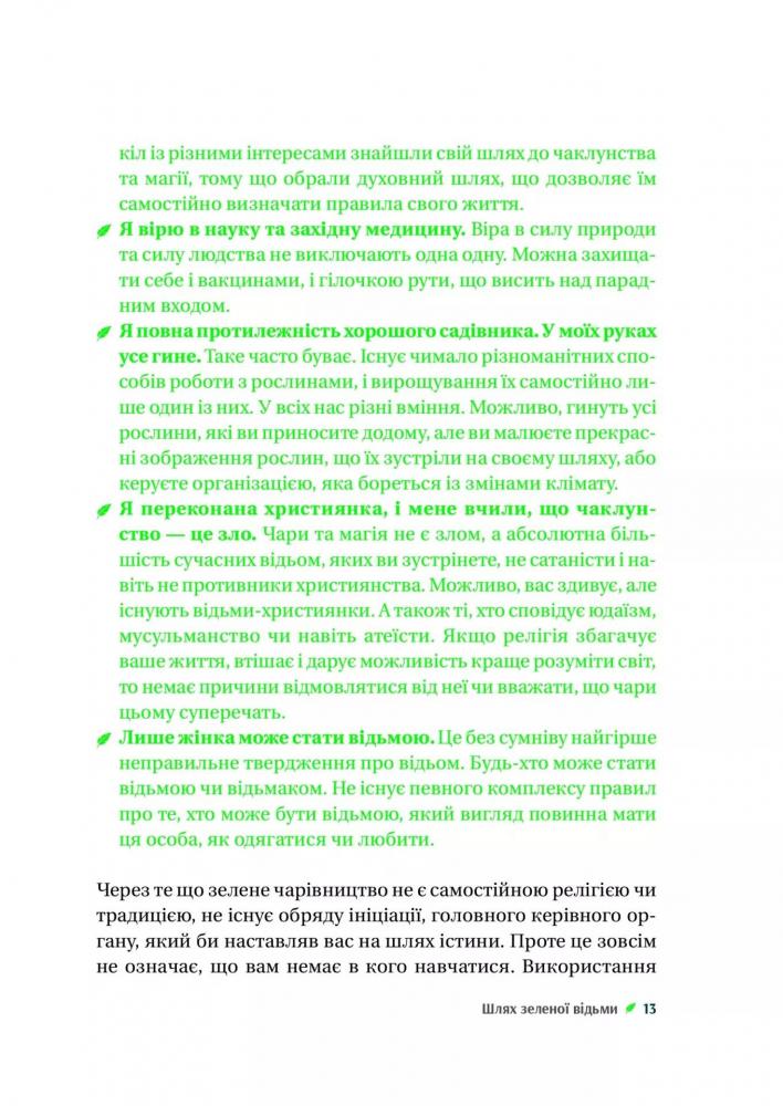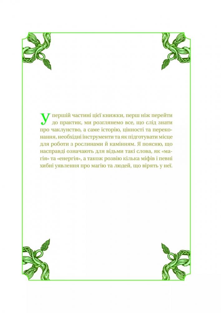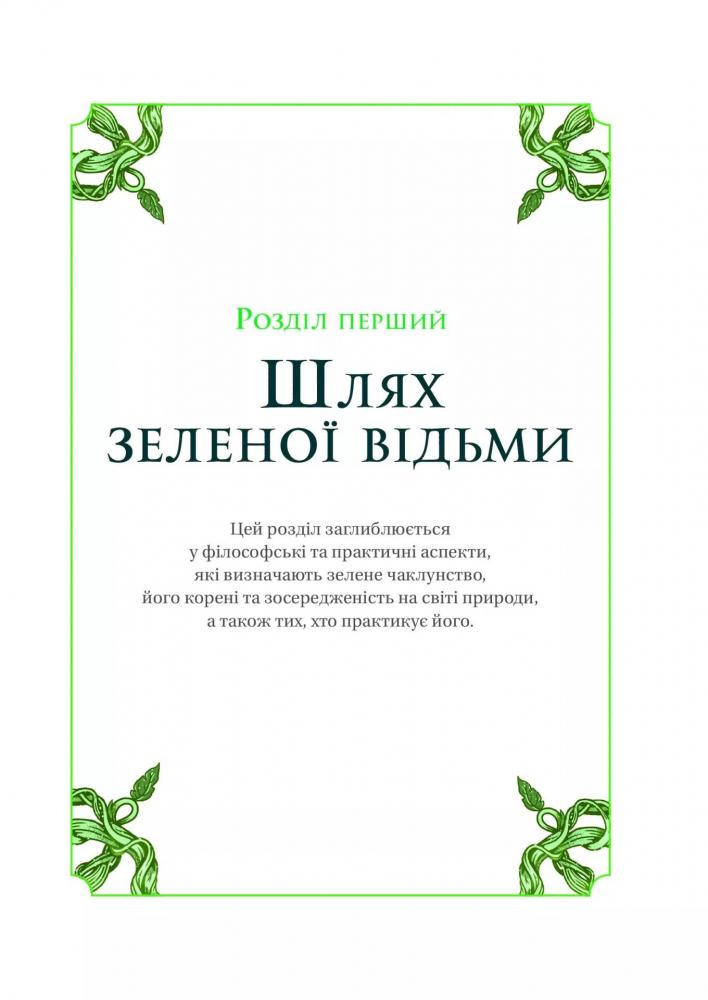 У ваших руках практичний посібник із зеленого чаклунства, який допоможе встановити або посилити зв’язок із рослинами, квітами та камінням. Бо що більше ви віддаєте землі, то більше від неї натомість отримуєте. І вам не треба відмовлятися від своїх принципів і вподобань: віри в науку, медицину, Бога, життя у великому місті чи ділового костюма. Магія — це природна енергія уяви, натхнення та інтуїції, яка живить ваші мрії та прагнення. Тож ваше завдання — навчитися використовувати цю енергію собі на користь. Вам знадобляться кілька перевірених відьомською спільнотою заклинань, кристали, нескладні інструменти та трішки допитливості. І пам’ятайте: будь-хто може стати зеленою відьмою або зеленим відьмаком.