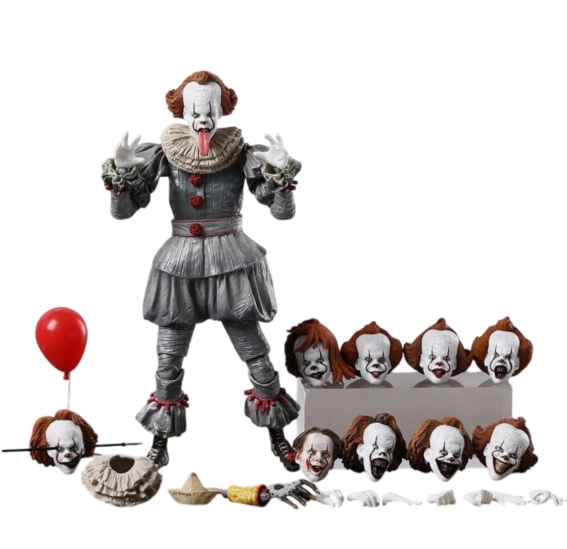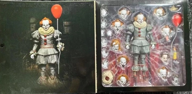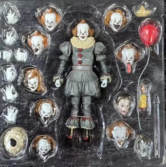 Оно - Пеннивайз (It - The Many Faces of Pennywise Clown Action Figure) - это фигурка клоуна Пеннивайза по фильму 2017 года "Оно" из финальных сцен фильма, когда дети сражались с клоуном. В комплект также входит: 9 х сменных головы, 7 х руки и еще дополнительные аксессуары. Фигурка выполнена качественно. Фирма производитель: Китай Материал: пластик Высота фигурки около 18 см